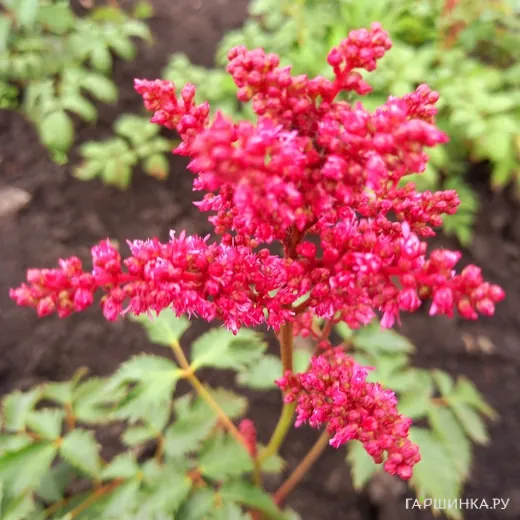 Цветы астильбы собраны в плотные метельчатые соцветия, окрашенные в насыщенный красный цвет. Цветение происходит в июле-августе и продолжается несколько недель, привлекая бабочек и других опылителей. Плоды астильбы представляют собой коробочки, однако они не имеют декоративного значения и не используются в пищу.