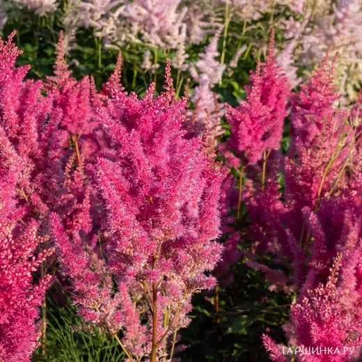 Астильба Арендса Глория Пурпуреа – многолетнее корневищное растение. Высота растения около 60 см. Раскидистый кустик пирамидальной формы с мелкими цветками, собранными в длинные густые соцветия. Окрас цветков темный сиренево - розовый. Цветет в июле и отличается продолжительным цветением.