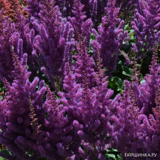 Высота у данного вида астильб средняя, равняется примерно 70 см, диаметр при этом – 50 см. Корневая система прочная, поэтому культура совершенно не боится ветров. Соцветия у астильбы весьма крупные, длинные (от 30 до 35 см в высоту) и пушистые. По внешнему виду напоминают метелки. Цвет их фиолетовый, как уже упоминалось, самый темный из всех имеющихся астильб. Цветки, образующие соцветия, маленькие, уложены плотно.
