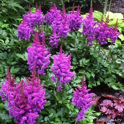 Астильба китайская Вижнс – многолетнее корневищное растение. Высотой до 70 см, с крепкими, прямыми стеблями. Листья дважды или трижды перистые, тёмно-зелёные с бронзовым оттенком, блестящие. Цветки темно-карминно-розового, очень красивого цвета. Цветение июль - август.