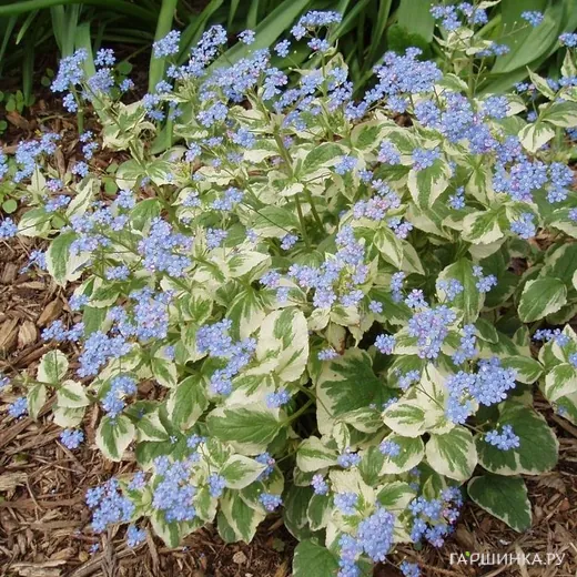 Бруннера Вариегата - очень декоративный сорт серебристо-зелеными листьями и мелкими голубыми цветками.
