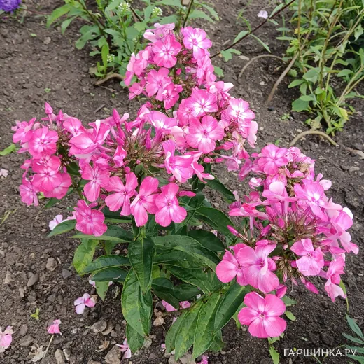Флокс Евгения - Ярко-розовый с малиновым центром и белыми мазками вокруг него, которые лучше выражены в прохладную погоду. Края лепестков слегка завернуты вверх. Соцветие округлое. Компактный прочный куст, высота взрослого растения 70 см. Цветки в диаметре до 4 см. Цветение июль-август.