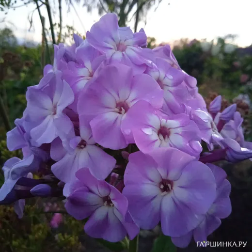 Флокс Мирослав - высота растения 80-85 см. Срок цветения среднепоздний. Соцветия удлиненные, овальные. Цветок колесовидной формы, диаметром 3,7 см, светло-сиреневый с белым центром.