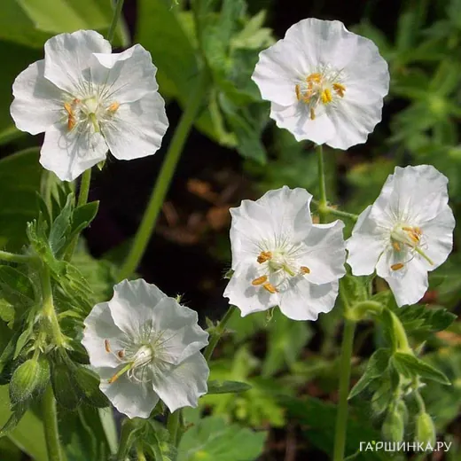Цветки герани темной Альбум белоснежные, с легким розовым оттенком в центре, собраны в соцветия, которые привлекают внимание своей нежностью. Цветение начинается в июне и продолжается до августа, создавая атмосферу легкости и свежести в саду. Это растение отлично подходит для создания бордюров, альпийских горок и миксбордеров. Благодаря своей самоплодности, герань темная Альбум не требует наличия опылителей, что облегчает ее выращивание.