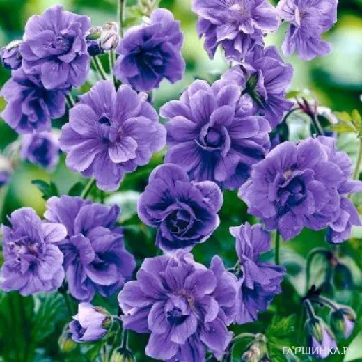 Герань садовая Пленум – эффектный почвопокровный неприхотливый многолетник. Высота 30 - 45см. Цветки диаметром 4 - 5 см махровые, фиолетовые, по форме напоминают старинные розы. Период цветения июнь- июль.
