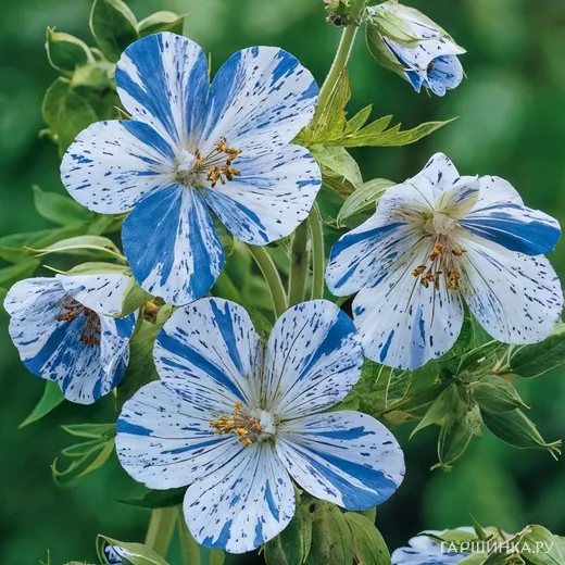 Цветки герани Сплиш Сплеш привлекают внимание своей необычной окраской: белые лепестки покрыты голубыми и фиолетовыми полосками и пятнами, создавая эффект брызг. Диаметр цветков составляет около 4 см, и они собраны в рыхлые соцветия. Период цветения длится с июня по август, что позволяет наслаждаться их красотой на протяжении всего лета.