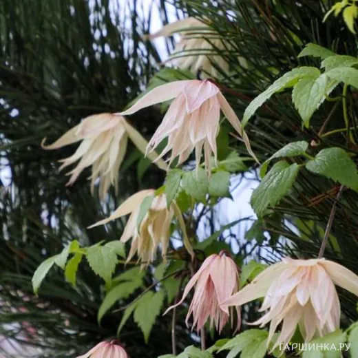 Клематис (Княжик) Пинк Свинг (Розовые качели) махровый крупноцветковый (1) - Цветки махровые, колокольчикообразные, свешивающиеся, слегка пахнущие грейпфрутом, сидящие на пурпурных цветоножках. Цветки складываются из эллипсообразных, вытянутых, остро заканчивающихся со слегка волнистыми краями чашелистиков, на внешней стороне кремово-розовые, снизу светло-розовые, иногда почти кремового цвета. Цветет в мае и повторяет цветение, но уже менее обильно – летом. Имеет красивые темно-зеленые относительно крупные (до 23 см длиной и 19 см шириной) листья – тройные, тройчатосложенные, с красивой фактурой и зубчатыми краями листочками.