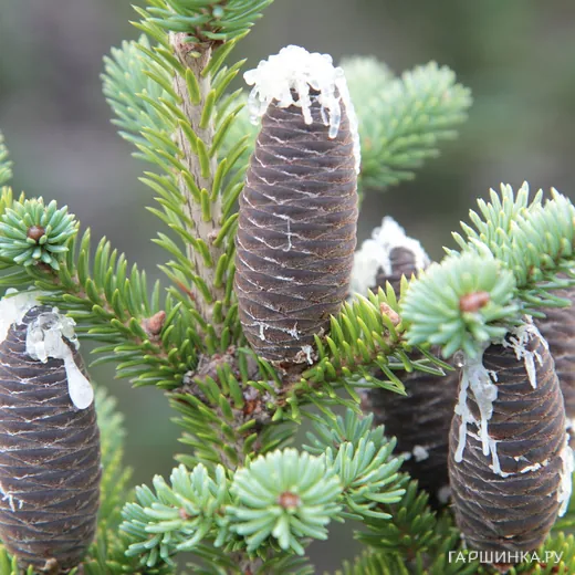 Пихта бальзамическая - дерево высотой до 25-35 м. Крона правильная, конусовидная, опускается до земли. Кора гладкая серо-коричневая. Хвоя от 15 до 25 мм, темно-зеленая, блестящая. Шишки овально-цилиндрические до 10 см длиной, в начале развития имеют фиолетовую окраску.