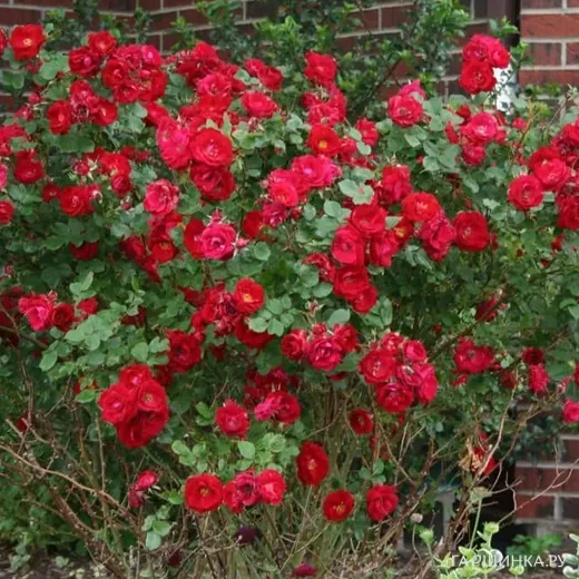 Цвет розы настолько насыщенный и яркий, что она притягивает взгляд из любого уголка сада. У меня растет рядом с темно-синими дельфиниумами - очень эффектное сочетание получилось. Цветет очень обильно, каждая веточка заканчивается букетиком чудесных цветов.